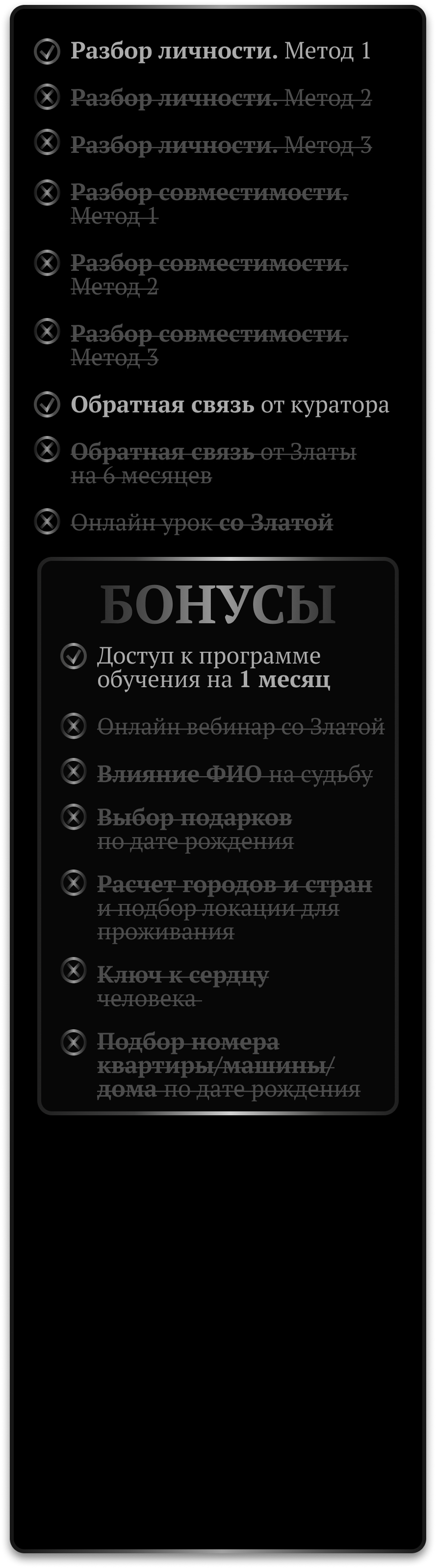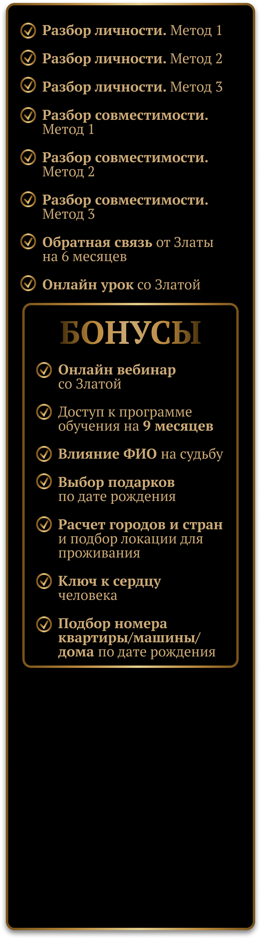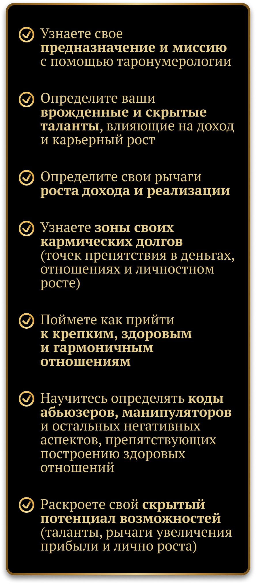 Расчет базовых нумерологических показателей, таких как: энергия ресурса, энергия жизненного урока, энергия итога жизни, главные три карты судьбы, карты главных жизненных периодов, карты кармических показателей, карты даров свыше, карты стопоров и блокировок, энергия атмосферы судьбы, энергия атмосферы кармы,